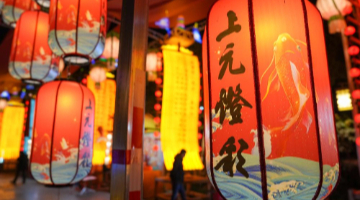 1月22日晚,游客在西安大明宫国家遗址公园灯会上逛国潮集市。