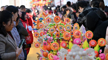 3月20日,人们在北京王府井工艺美术大厦内观看非遗文创产品展示。