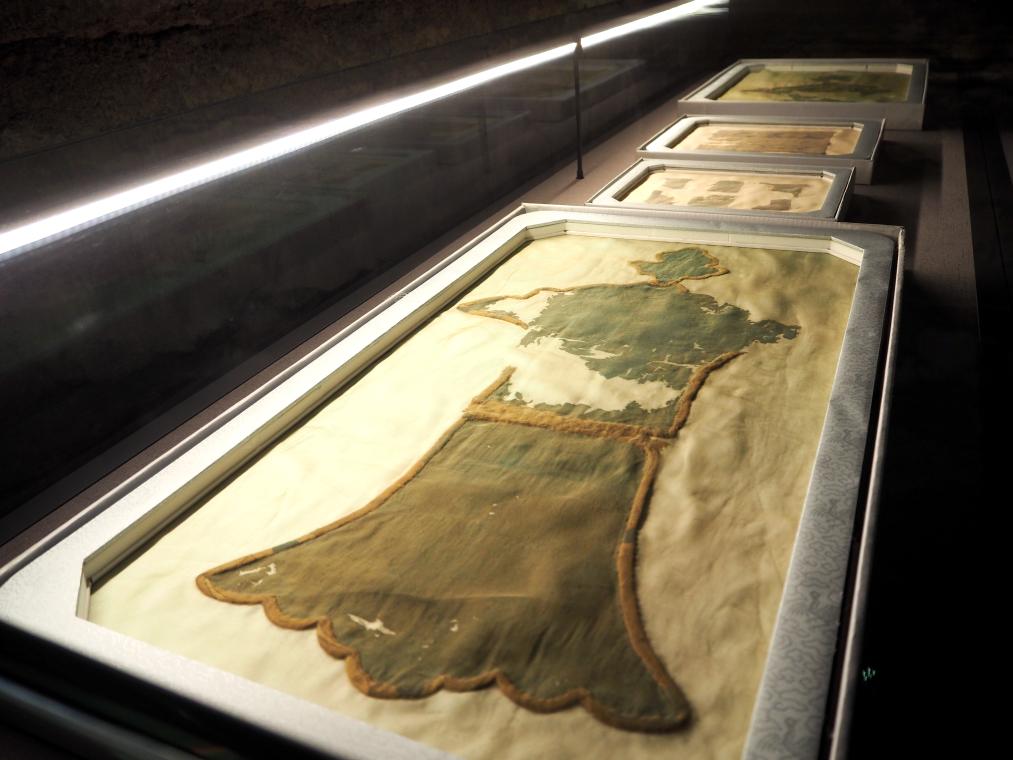修复后的王冠纺织品内衬在定制好的展示匣中。(新华社记者白玛央措 摄)