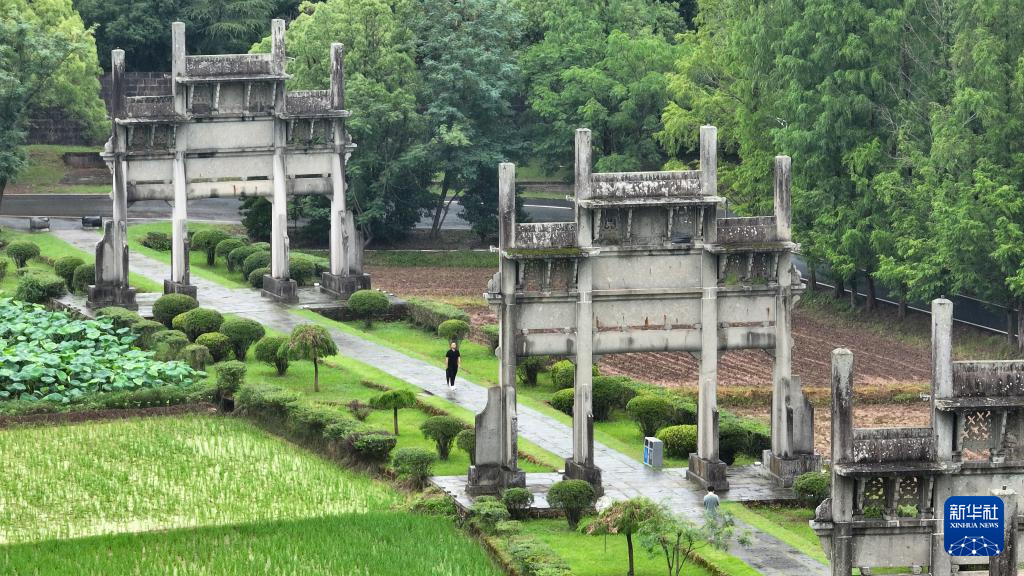 6月19日,周虎在位于歙县的全国重点文物保护单位棠樾牌坊群巡查(无人机照片)。