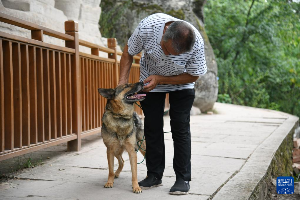 6月14日,曾祥余和他的狼狗“小小”在茗山寺巡查摩崖造像。
