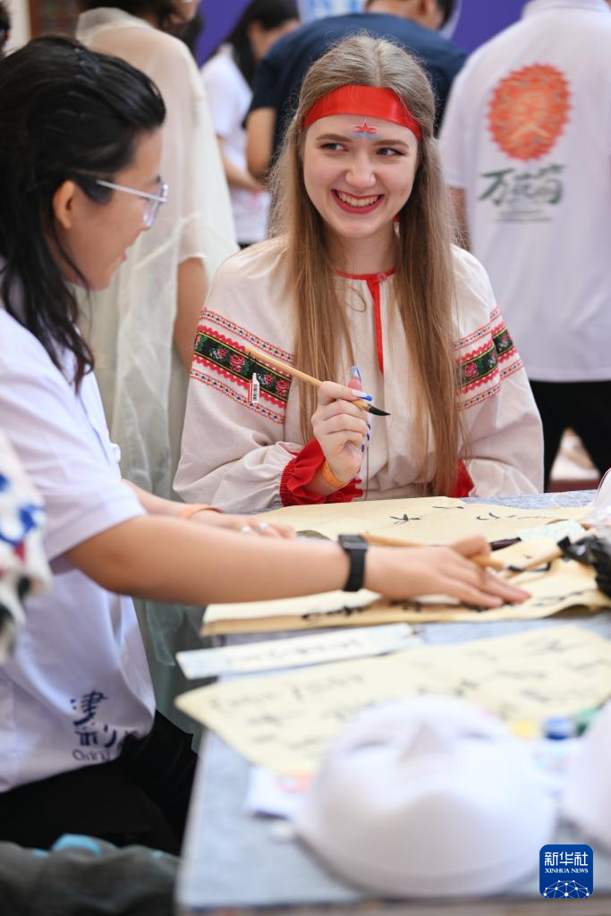 8月6日,上合国家青年学生在体验书法。