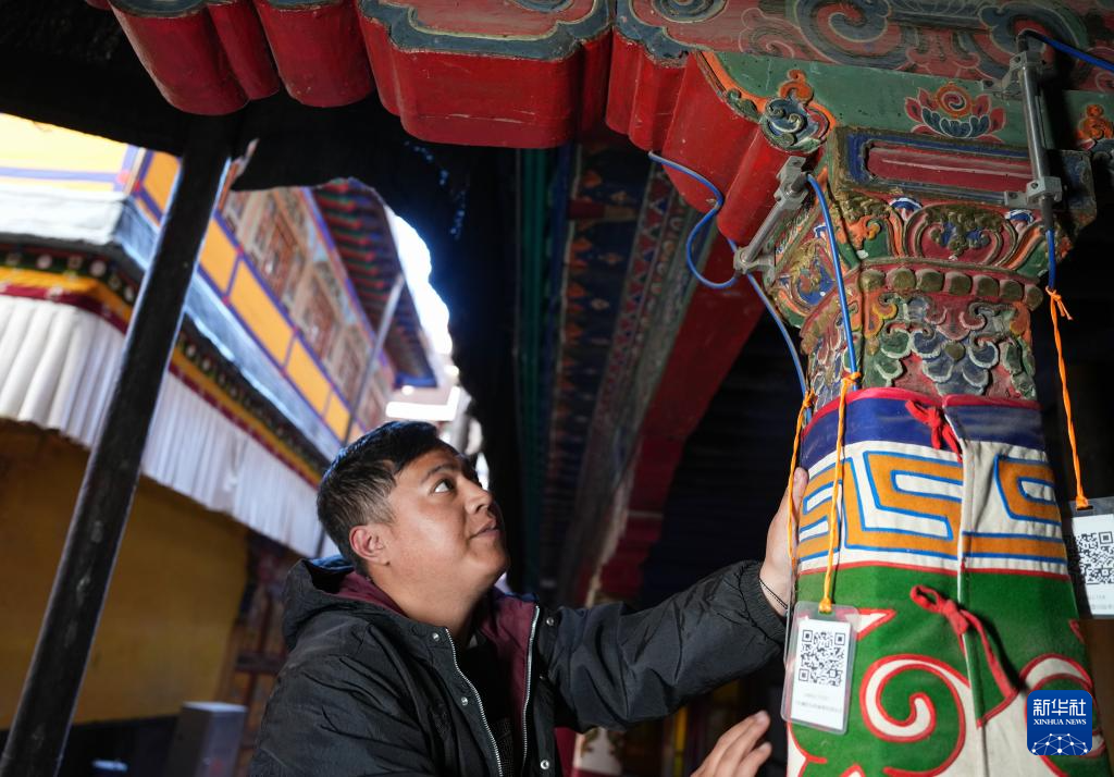 布达拉宫监测中心的工作人员旦增旺堆巡查布达拉宫木结构传感器设备(2024年12月4日摄)。新华社记者 晋美多吉 摄