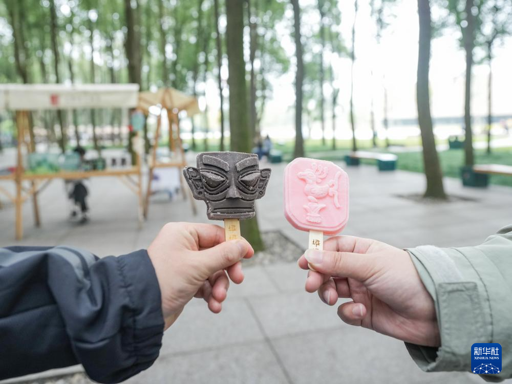 在四川省广汉市三星堆博物馆,两名游客在展示文创雪糕产品(10月30日摄)。
