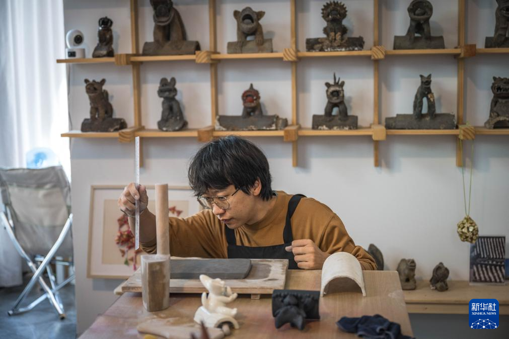 11月7日,张航在“心房瓦猫博物馆”制作瓦猫。