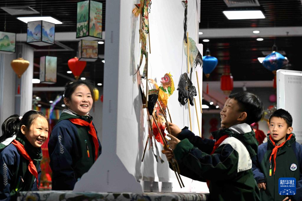 1月6日,小朋友在河北省群众艺术馆“大美河北 欢乐春节”非遗主题展览互动区体验皮影戏。