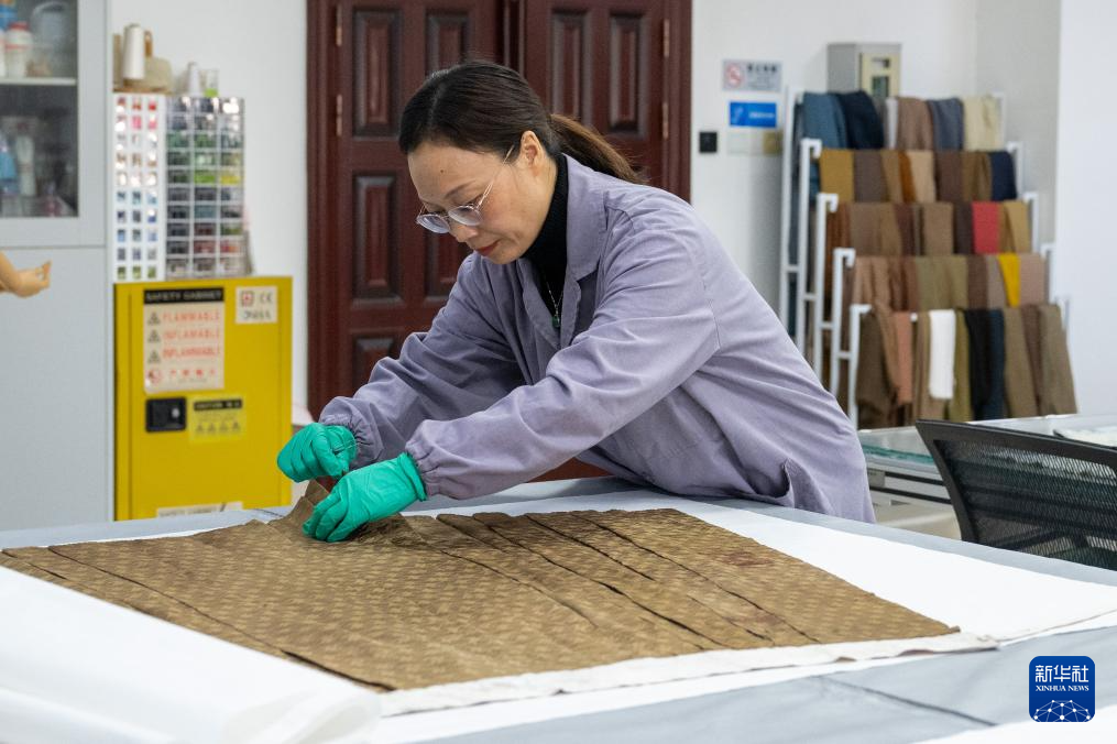 1月9日,在湖北荆州文物保护中心,纺织品文物修复室负责人陈绍慧检查一件纺织品文物。