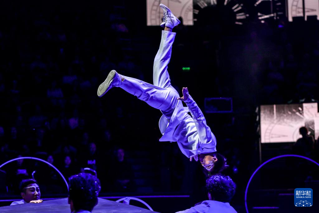 1月12日,在匈牙利首都布达佩斯,中国杂技团演员在表演《时光》。