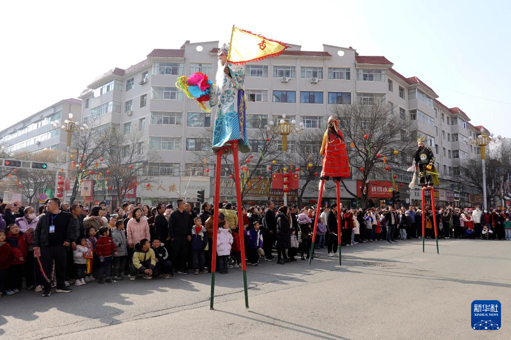 3月1日,甘肃省白银市会宁县会师镇北关社火队在会宁县城进行高跷巡演。