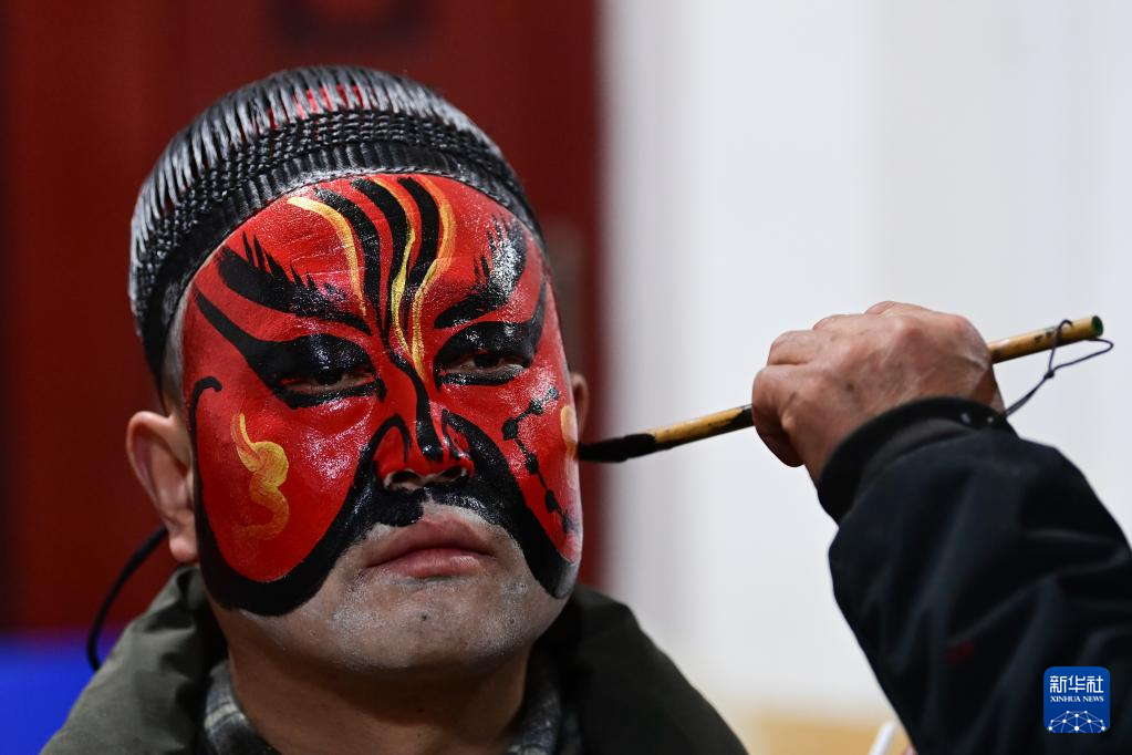 3月2日凌晨,老艺人为陇县黄花峪村社火队队员绘制社火脸谱。