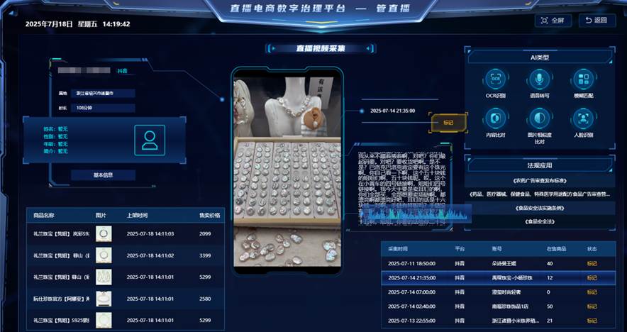 诸暨市以算力换人力,摸排直播营销中“谁带的货,带谁的货”,打造全流程、全时段智慧监管体系,目前已纳管抖音、淘宝、视频号、小红书等10个主要直播平台的8282个直播账号、951个重点个人视频号,对直播间进行全天候无感监测。重点做好了以下三方面工作: