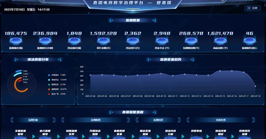 目前已完成了三个场景建设,一是直播行为“云眼监测”:系统24小时全天候无感监测直播行为、商品及评价等核心指标。通过AI切片分析、语音识别、图像比对,自动抓取并定位疑似违法线索,并通过人工复审增强违法线索核查处置精度;二是违法线索“云端固证”:利用区块链存证平台,将违法线索一键上链固证,自动生成具有法律效力的规范固证文书,确保证据法律效力。三是监测数据“云脑分析”:依照直播间地域分布形成“直播地图”,并以违规程度为标准实施四色分类,实时标注开播状态,对自动生成的月度监测报告和日常投诉举报反馈的虚假宣传、违法广告、价格欺诈等6类高频违法违规行为实施重点监测,使行业重点直播间违法行为发生率大幅下降。