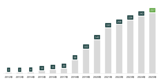 数据容量是指将一个地方平台中可下载的、结构化的、各个时间批次发布的数据集的字段数(列数)乘以条数(行数)后得出的数量,体现的是平台上开放的可下载数据集的数据量和颗粒度。2019年以来,各地平台无条件开放的可下载数据集的容量从2019年的约15亿到2025年超1907亿(如下图所示),六年间增长了126倍,复合年均增长率为124%。