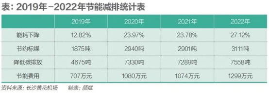 2021年和2022年,长沙黄花机场的能耗同比上年再次下降超过20%,两年的节能降费分别为1074万元和1299万元。