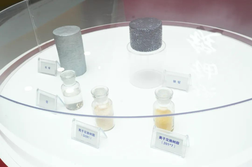 陈列其中的中国第一块铀锭、第一块钍锭、六氟化铀浅黄色晶体、第一克镭的复制品……诉说着它们的来之不易。1958年,面对一穷二白的基础,矿业人硬是在最短的时间内,简法生产了吨级量的二氧化铀和四氟化铀,提炼了我国第一块铀锭,第一块钍锭,加速了试验第一颗原子弹的工作进程,使中国第一颗原子弹试验时间提前了365天。