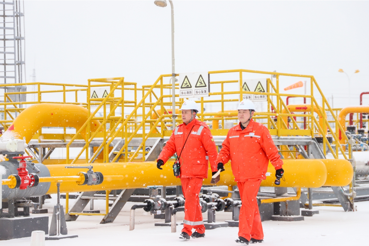 "黑龙江肇源,中俄东线天然气管道肇源作业区员工在雪中全面巡检站场设备和管道沿线设施,保障管道安全平稳运行。"