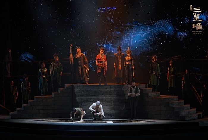 音乐剧《三星堆》力求中国故事、国际表达,汇聚中外顶尖创作班底,用国际化的创作理念、技术手段以及世界通用的音乐语言,为传统文化的活态传承探索出时尚表达的新形式,打开了跨界融合的新空间。在数月时间里,中西方顶尖专家共同对剧本、舞美、音乐等进行多轮商讨、打磨与调整。这部剧由曾荣获中国话剧金狮奖的国家京剧院院长王勇担任总编剧,外方导演是音乐剧《泰坦尼克号》的导演汤姆·萨瑟兰,他通过神人共治的古国治理、工匠铸器的恢弘场面以及古老的预言、无奈的迁徙等叙事框架和人物关系,营造出古蜀王朝的瑰丽恢弘和神秘质感;舞美设计摩根·拉知,曾获2018年英国戏剧奖最佳设计奖和4次奥利弗奖,他引领舞美团队不仅在色彩和道具上还原青铜王朝的辉煌,还通过200余台电脑灯,打造不同场景的光影效果,使观众得以首次在音乐剧舞台上,一次性看到青铜大立人、青铜大面具、青铜神树等三星堆代表性文物的复刻版。