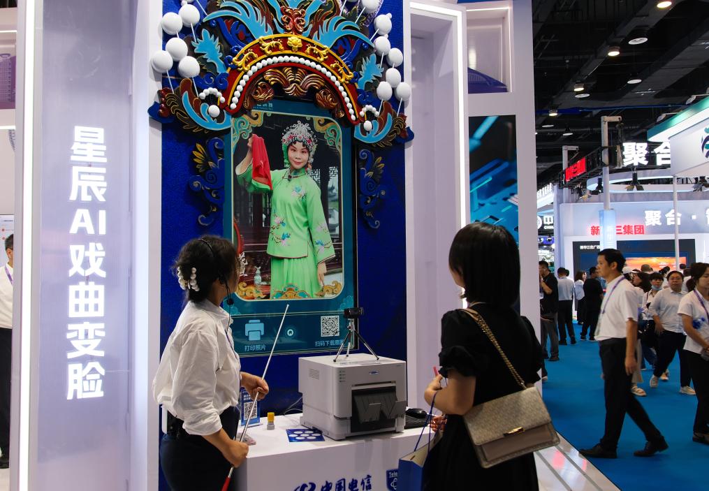 9月17日,参观者在广西南宁国际会展中心内体验一款AI戏曲变脸装置。