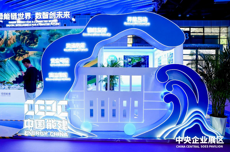 中国能建展厅以“绿能链世界 数智创未来”为主题,通过图文、沙盘、视频等手段,全方位、立体化、沉浸式展示了大型水电、清洁煤电、压缩空气储能、绿色氢氨醇等国际领先技术,以及能源大数据平台、交能融合智慧管理平台等数字化解决方案。