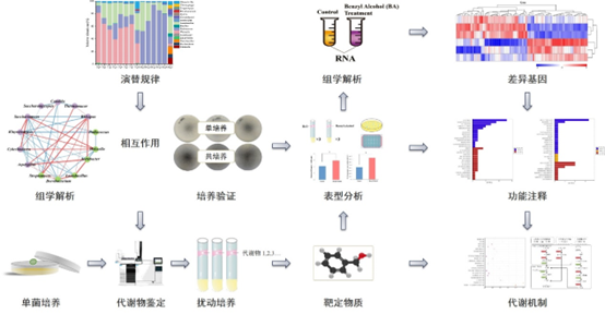 该论文的研究内容包括如下方面:(1)采用扩增子测序技术揭示了该过程中微生物群落组成及演替规律,进而结合统计学分析明确了原位体系中功能微生物之间的相互作用;(2)以原位体系分离纯化的功能微生物为对象,采用双碟法结合非接触培养模式,验证了各微生物成员间的相互作用;(3)在单菌培养模式下鉴定供体微生物产生的主要挥发性有机化合物,再依次扰动受体微生物的生长,进而基于受体微生物的生长情况确定具有显著影响的化合物;(4)采用转录组学技术比较分析了在化合物扰动与非扰动模式下受体微生物的代谢差异,以关键化合物在微生物细胞间的感应与通讯机制。上述研究表明:微生物释放丰度的挥发性有机化合物,在微生物种内或种间的远程互动或交流中扮演重要角色;这些物质通过细胞壁或细胞膜扩散,影响微生物细胞生长或代谢,以促进成员间的协同生长(图2)。该研究也提供了一种潜在策略,通过调节体系内挥发性有机化合物以干预制曲过程中功能微生物的生长或代谢,有待深入研究。