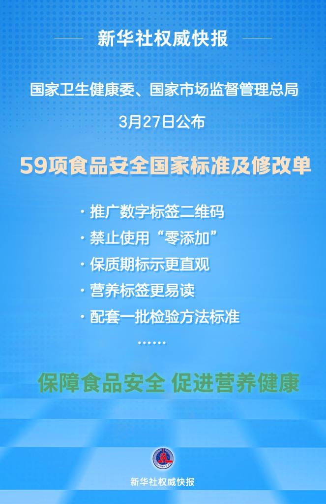 国家卫生健康委、国家市场监督管理总局3月27日公布59项食品安全国家标准及修改单。消费者特别关心的“零添加”、食物过敏、盐油糖标示等内容,均有明确规定,旨在进一步提升食品安全保障水平,维护公众健康,促进食品产业高质量发展。