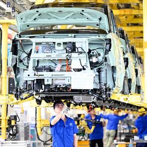 2021年8月12日,廣西柳州一家汽車企業(yè)的工人在新能源汽車生產(chǎn)線上忙碌。新華社發(fā)