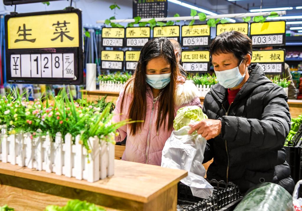 1月18日,居民在廣西興業縣“老鄉家園”配套建設的平價超市內購買蔬菜。新華社記者 曹祎銘 攝