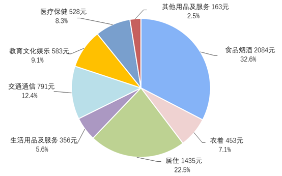 一季度,全國居民人均食品煙酒消費支出2084元,增長4.9%,占人均消費支出的比重為32.6%;人均衣著消費支出453元,增長3.6%,占人均消費支出的比重為7.1%;人均居住消費支出1435元,增長6.7%,占人均消費支出的比重為22.5%;人均生活用品及服務消費支出356元,增長4.8%,占人均消費支出的比重為5.6%;人均交通通信消費支出791元,增長12.7%,占人均消費支出的比重為12.4%;人均教育文化娛樂消費支出583元,增長6.9%,占人均消費支出的比重為9.1%;人均醫療保健消費支出528元,增長9.1%,占人均消費支出的比重為8.3%;人均其他用品及服務消費支出163元,增長17.1%,占人均消費支出的比重為2.5%。