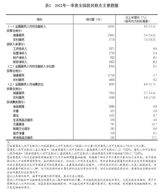 一季度,全國居民人均可支配收入10345元,比上年名義增長6.3%,扣除價格因素,實際增長5.1%。分城鄉看,城鎮居民人均可支配收入13832元,增長(以下如無特別說明,均為同比名義增長)5.4%,扣除價格因素,實際增長4.2%;農村居民人均可支配收入5778元,增長7.0%,扣除價格因素,實際增長6.3%。