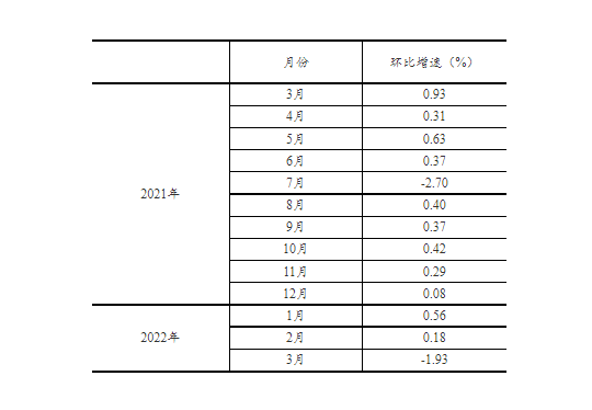 根據季節調整模型自動修正的結果,對2021年3月份以來的社會消費品零售總額環比增速進行修訂。修訂結果及2022年3月份環比數據如下: