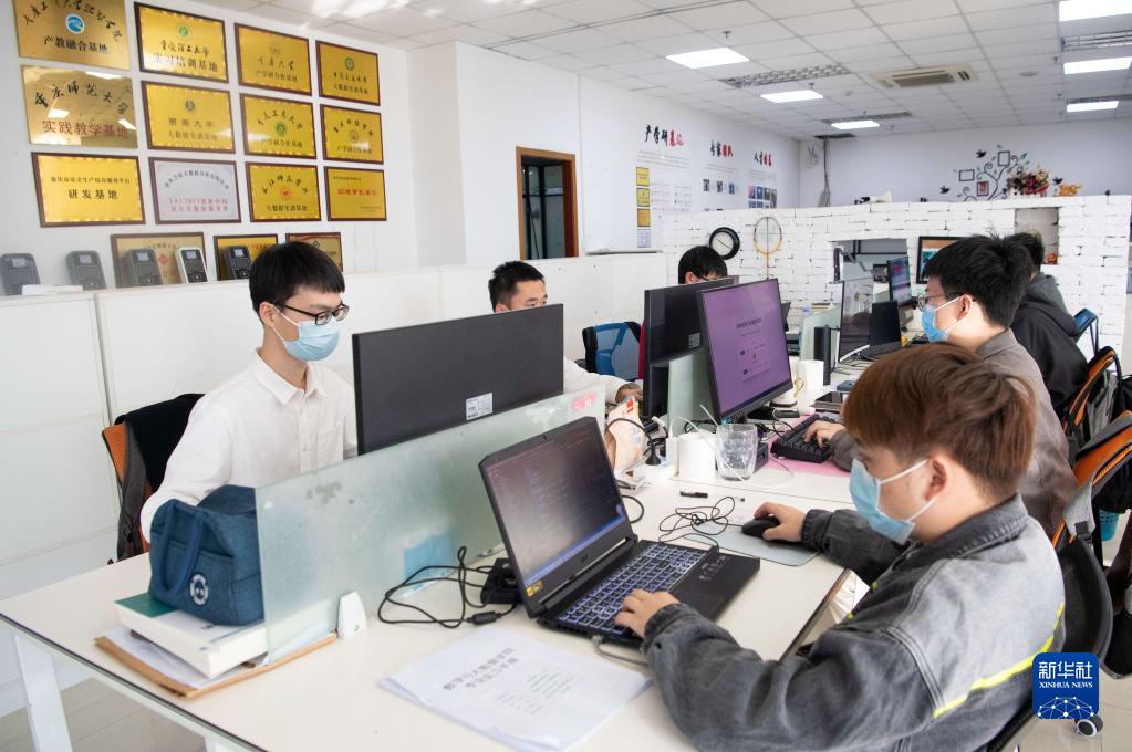 在位于重慶大渡口的“大眾創業萬眾創新示范基地”內,大學畢業生和青年人才在一家名為重慶芝諾的大數據公司內工作(3月28日攝)。新華社記者 唐奕 攝