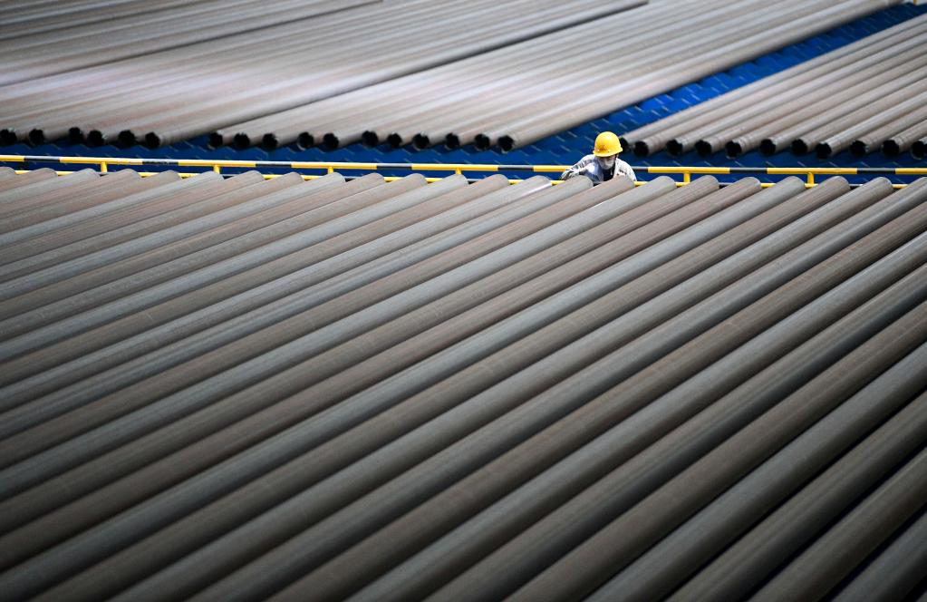 2022年4月19日,在位于承德市營(yíng)子區(qū)的承德建龍?zhí)厥怃撚邢薰緹o(wú)縫鋼管廠,工人檢查無(wú)縫鋼管品質(zhì)。新華社發(fā)(王立群 攝)