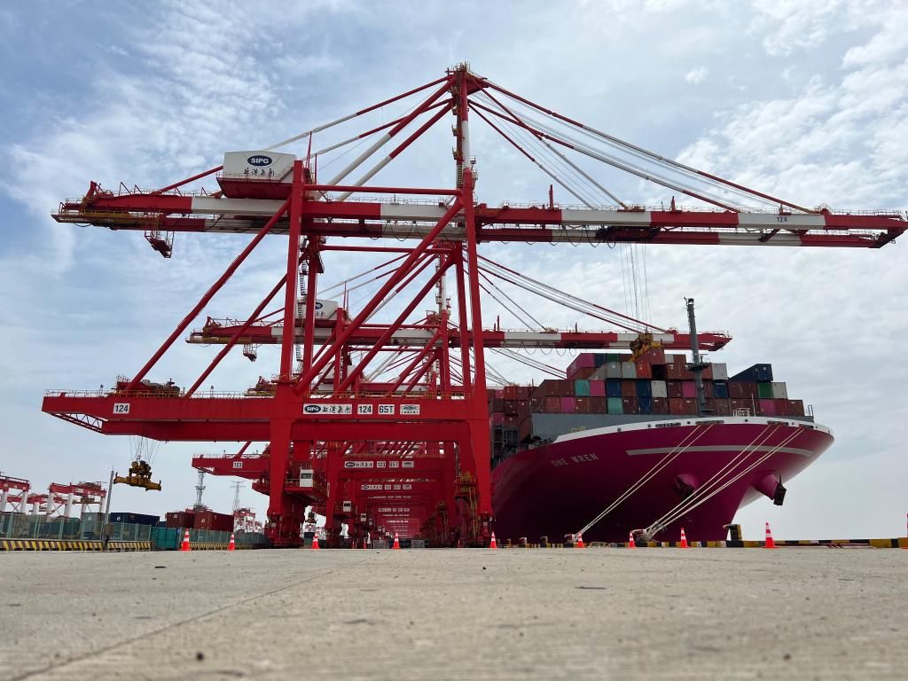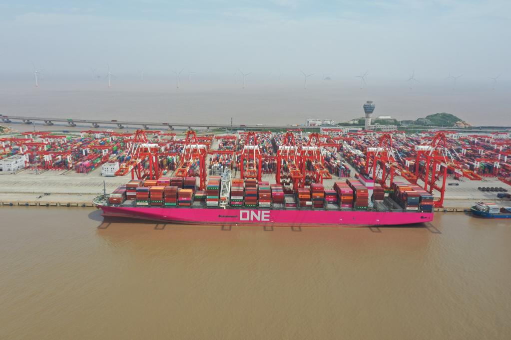 大型遠洋貨輪正在洋山深水港靠泊裝卸。(受訪者供圖)