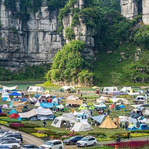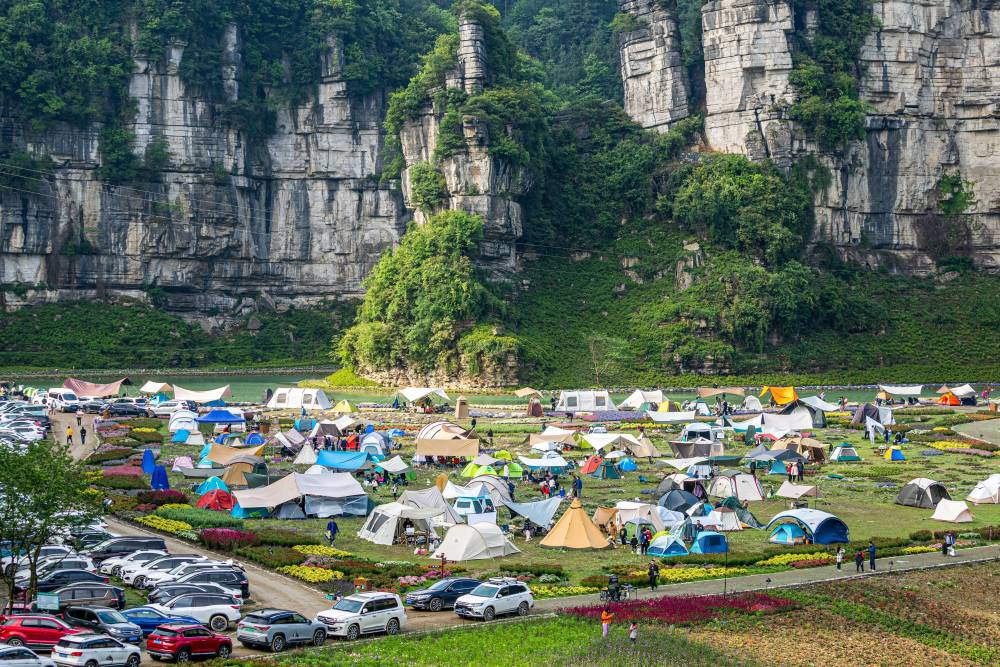 5月2日,人們在重慶市南川區萬卷書臺景區露營游玩。(新華社發)