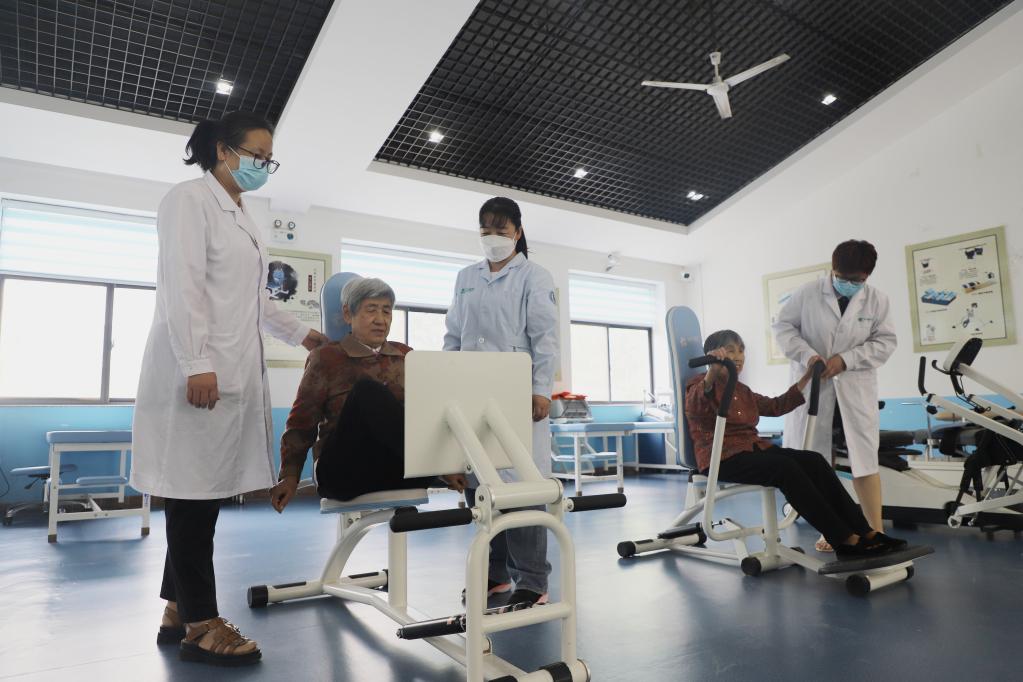 5月27日,在山東省博興縣呂藝鎮(zhèn)老年公寓醫(yī)養(yǎng)康復中心,醫(yī)護人員指導農(nóng)村老人利用專業(yè)器械進行康復鍛煉。(博興縣委宣傳部供圖)