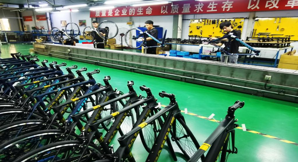 員工在山東泰山瑞豹復合材料有限公司車間里組裝碳纖維自行車。(受訪者供圖)