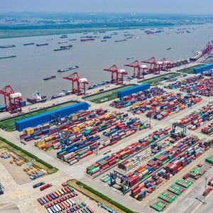 這是5月6日拍攝的江蘇省港口集團南京港龍潭集裝箱有限公司港口(無人機照片)。江蘇省港口集團在做好疫情防控的同時,積極發揮港航一體化體系優勢,全力確保產業鏈、供應鏈安全穩定。新華社記者李博 攝