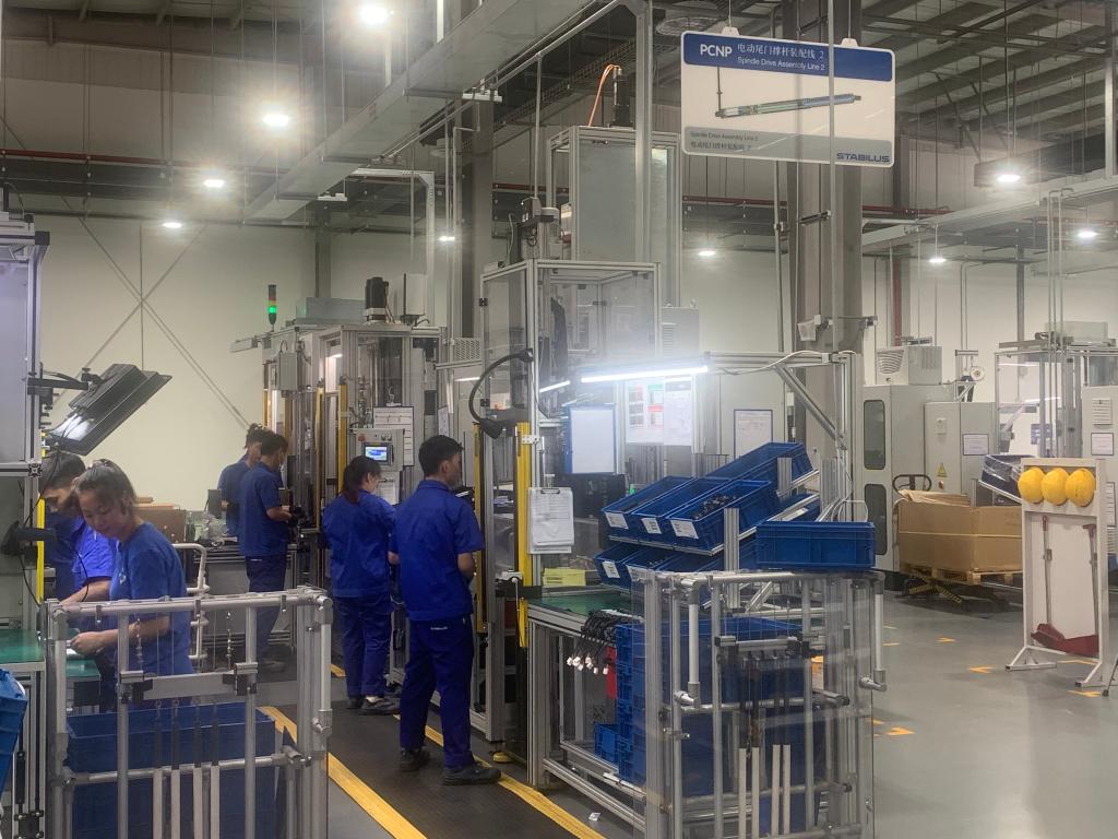 德國斯泰必魯斯(浙江)有限公司工廠,汽車電動尾門撐桿組裝線正在作業。(新華社記者 于佳欣 攝)