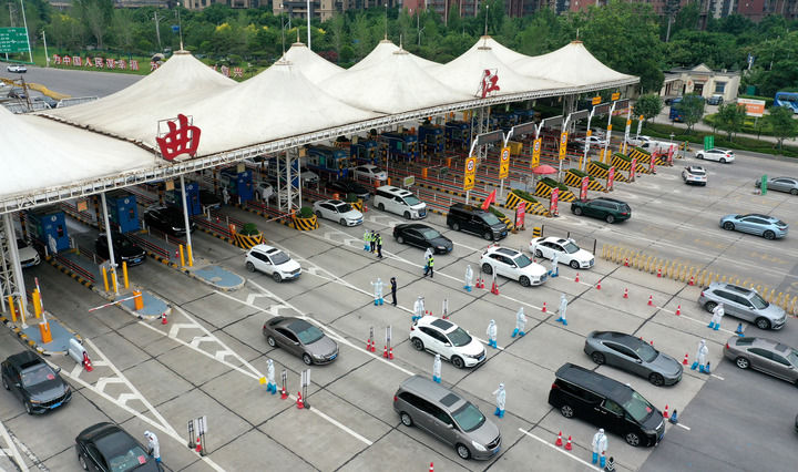 在西安繞城高速曲江收費站,車輛有序通行(5月21日攝,無人機照片)。新華社記者 劉瀟 攝