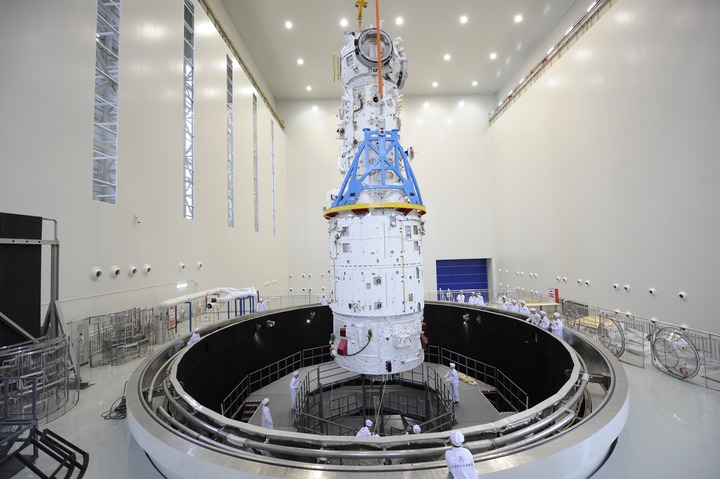 在中國(guó)航天科技集團(tuán)五院天津基地內(nèi),天和核心艙在進(jìn)行熱試驗(yàn)前吊裝(資料照片)。新華社發(fā)(航天科技集團(tuán)五院供圖)