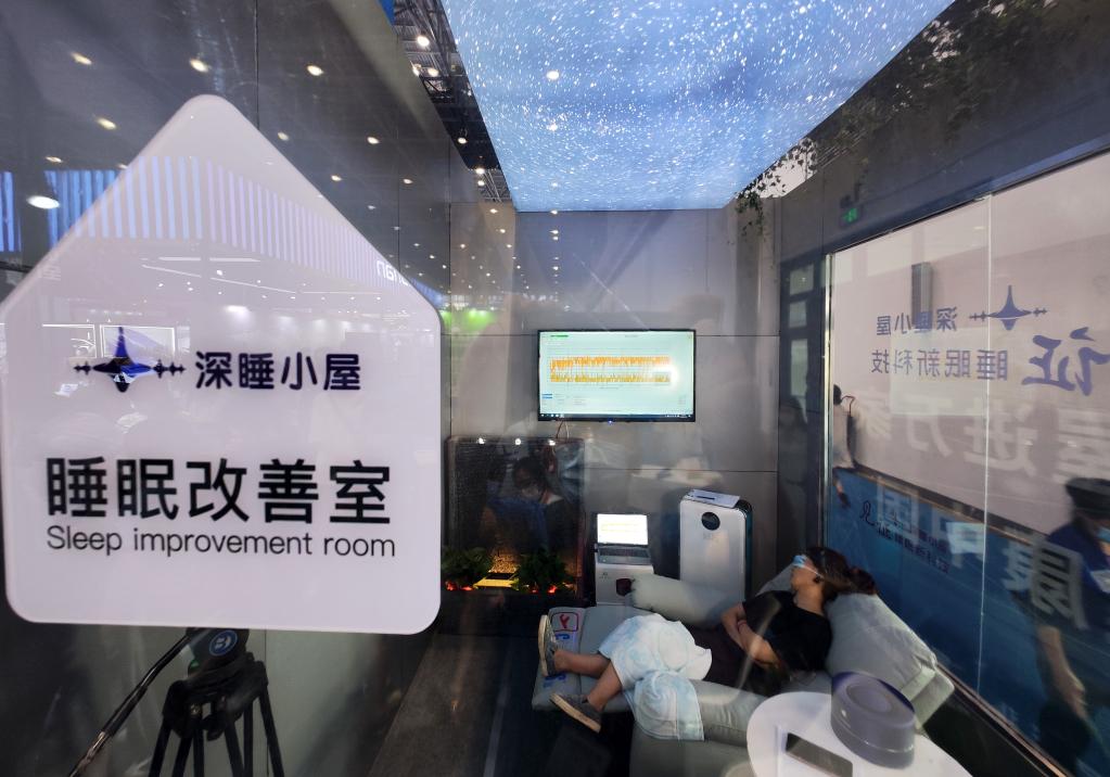 觀眾在體驗“深睡小屋”,屋內的設備用于改善睡眠質量。新華社記者郭程 攝