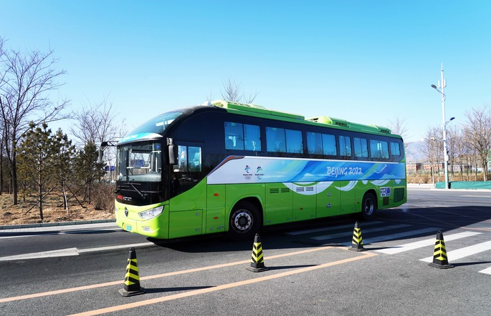 1月17日,氫燃料新能源車準備駛入北京2022年冬奧會和冬殘奧會延慶停保中心場站。新華社記者 任超 攝