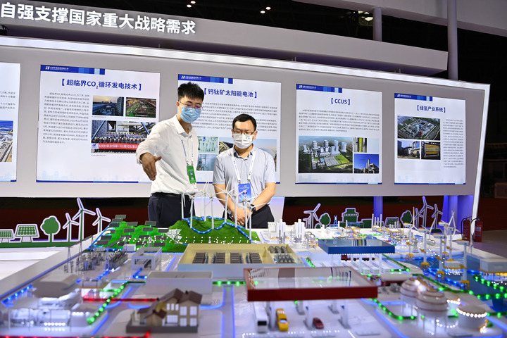 9月3日,在2022中國(太原)國際能源產業博覽會,中國華能集團有限公司工作人員向參觀者介紹其綠氫產業系統。新華社記者 楊晨光 攝
