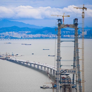 深中通道伶仃洋大橋東塔、西人工島及遠處的深圳市區(2022年6月7日攝)。深中通道全長24公里,集橋、島、隧、地下互通為一體,連接珠江口東西兩岸的廣東省深圳市和中山市,預計2024年建成通車。新華社記者 鄧華 攝