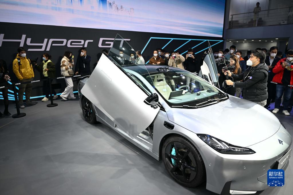 在第二十屆廣州車展的廣汽埃安展臺,參觀者觀看Hyper GT轎跑概念車(2022年12月30日攝)。新華社記者 鄧華 攝