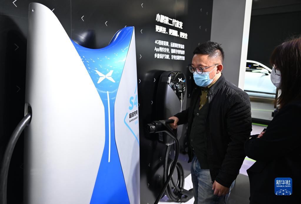 在第二十屆廣州車展的小鵬汽車展臺,參觀者體驗(yàn)S4超快充樁(2022年12月30日攝)。新華社記者 鄧華 攝