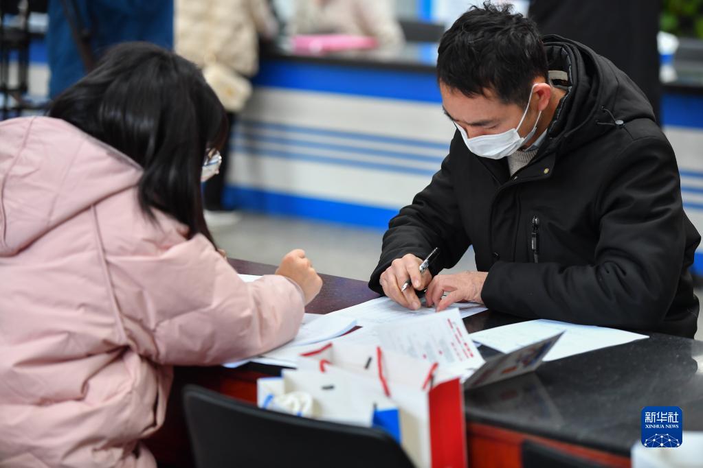 1月28日,在湖南省長沙市人力資源市場,求職者(右)在填寫應聘信息表。新華社記者 陳澤國 攝