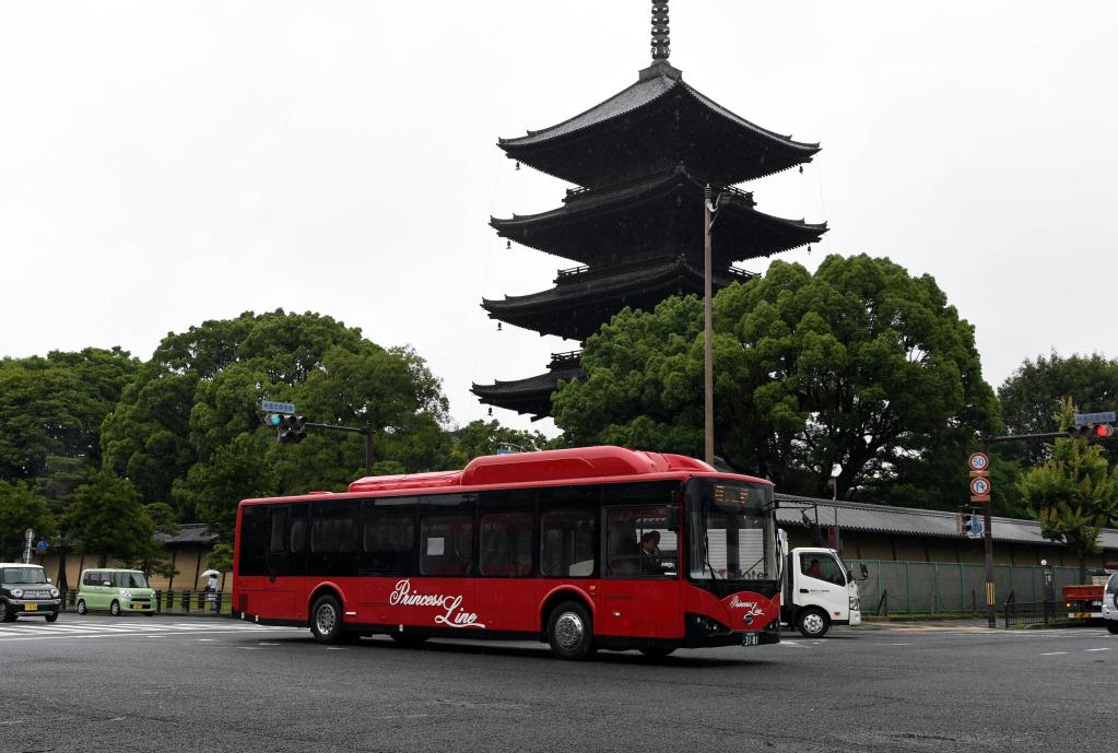 2018年6月20日,比亞迪電動巴士行駛在日本京都東寺大街。(新華社記者馬平攝)