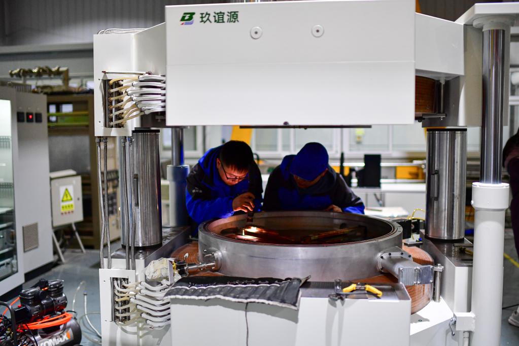 在四川玖誼源粒子科技有限公司生產車間內,兩名技術人員在檢查調試一臺國產醫(yī)用回旋加速器。新華社記者張超群 攝