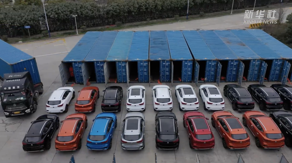 在上海集運(yùn)物流堆場(chǎng),1000臺(tái)汽車被裝進(jìn)集裝箱,搭乘超大型集裝箱船“中遠(yuǎn)海運(yùn)雙魚座”輪,從上海出運(yùn)至英國費(fèi)利克斯托港、比利時(shí)澤布呂赫港和德國威廉港。